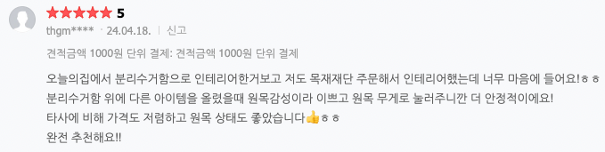 "오늘의집에서 본 분리수거함 인테리어를 보고 저도 목재재단 서비스를 이용하여 DIY해 보았는데, 결과에 너무 만족해요! 분리수거함 위에 다른 아이템을 올렸을 때 원목의 감성이 더해지고, 원목의 무게로 인해 더 안정적입니다. 타사 대비 가격도 저렴하며, 원목의 상태도 우수했습니다. 완전 추천합니다!!"