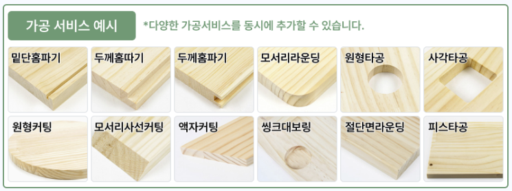 DIY 프로젝트를 더 이상 먼지 날리면서 하지 마세요. 온라인으로 쉽게 주문하실 수 있도록 제공해드리고 있으며 라운딩, 타공, 홈파기, 홈따기 등 여러 후가공 처리도 해드리고 있습니다.