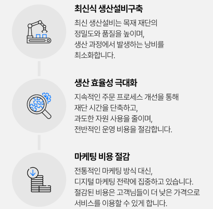 위드로우는 온라인 서비스와 자동화 공정을 갖추고 있어 오프라인 목공방에서는 제공하기 어려웠던 소량 다품종 가공이 가능합니다.