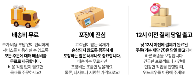 위드로우의 목재재단 서비스는 단순히 목재를 가공하는 것 이상의 가치를 제공합니다. 고객님의 요구와 필요에 맞춰 맞춤형 목재를 제공하여, 고객님의 창의적인 프로젝트를 지원합니다. 또한, 꼼꼼한 포장과 빠른 배송으로 고객님의 만족도를 더욱 높이고 있습니다.